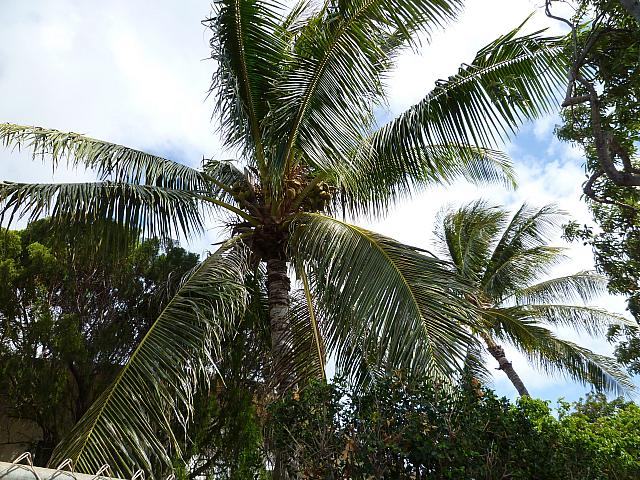 ヤシの実。ただしヤシの実は手のひらサイズになる前にプロに刈ってもらうことも多いんです。木が一般道路に張り出している場合、大きなヤシの実が通行している人や車の上に落ちたらタイヘン! 自分のウチの庭の中だってアブナイですけど(自分や家族、飼い犬等の上に落ちてくる危険性が~)。